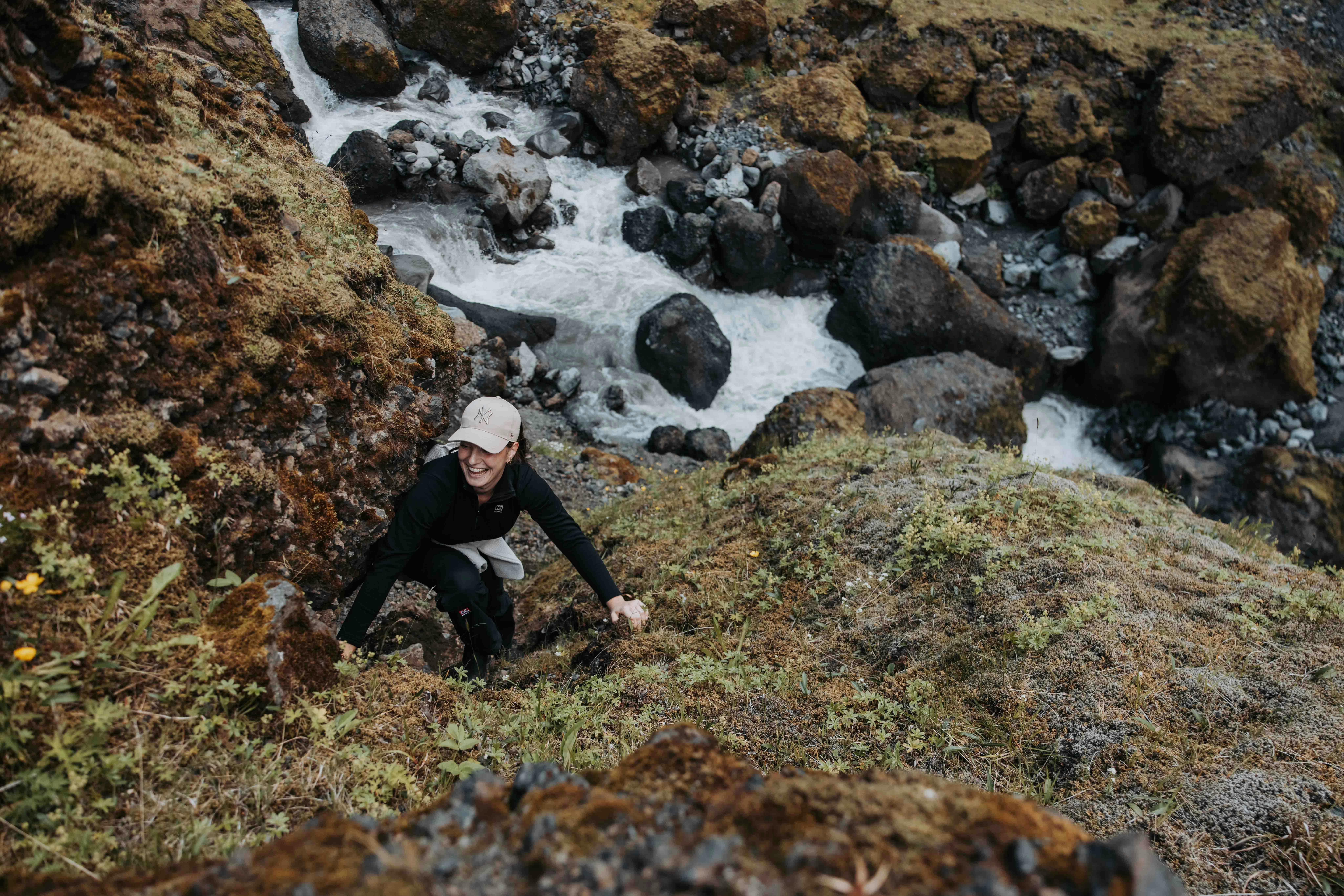 Auto geparkeerd. Wandelschoenen aan. Warme kleren aan en hop. Na een paar honderd meter kwam er een lastig stuk waarbij we flink moesten balanceren en klimmen om verder te kunnen komen. Op sommige momenten was er wel een, soort van, pad te zien dat we konden volgen. Op andere momenten was het gewoon freestyle de weg zoeken. Dit voelde al 10x avontuurlijker aan als een bezoek aan de Seljalandsfoss tussen de touring bussen, nú al.