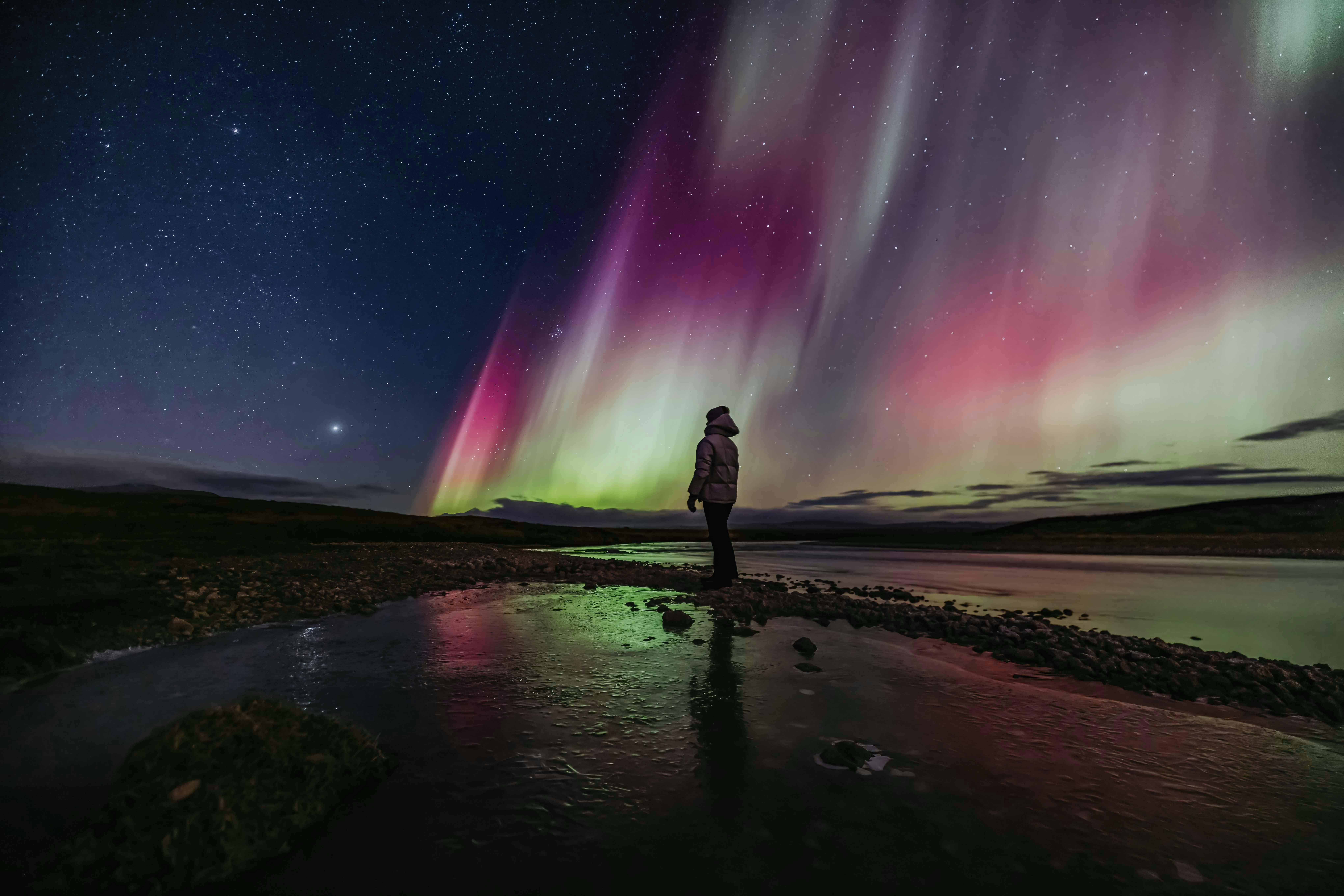 IJsland ligt dicht bij de noordelijke poolcirkel, precies onder het ovaalvormige gebied waar de aurora zich laat zien. Het arctische eiland is daarom ook erg populair als bestemming voor mensen die het noorderlicht willen zien. De dramatische landschappen geven nog een extra touch aan het mooie noorderlicht. Afgelopen oktober waren er enkele stevige zonnestormen. Als dit gebeurd kun je er de wekker op zetten dat je twee á drie dagen daarna de hemel gevuld hebt met groene, paarse en zelfs rode lichten in elke richting.